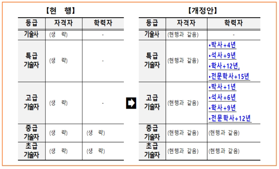 그동안 국가기술자격자에 한해서 특급 및 고급기술자 등급을 인정하였는데 국가기술자격이 없는 학력 ·경력 기술자도 특급 및 고급기술자로 기술등급을 인정하는 것으로 변경되었습니다.