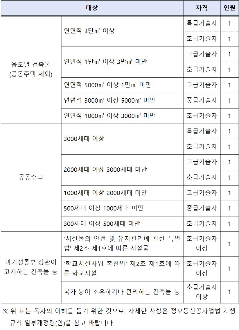 이날 입법예고된 시행령·시행규칙 개정(안)과 기준(안)은 정보통신설비 유지보수·관리기준 적용 대상 건축물·시설물의 종류 등 제도 시행에 필요한 세부사항을 정했다.